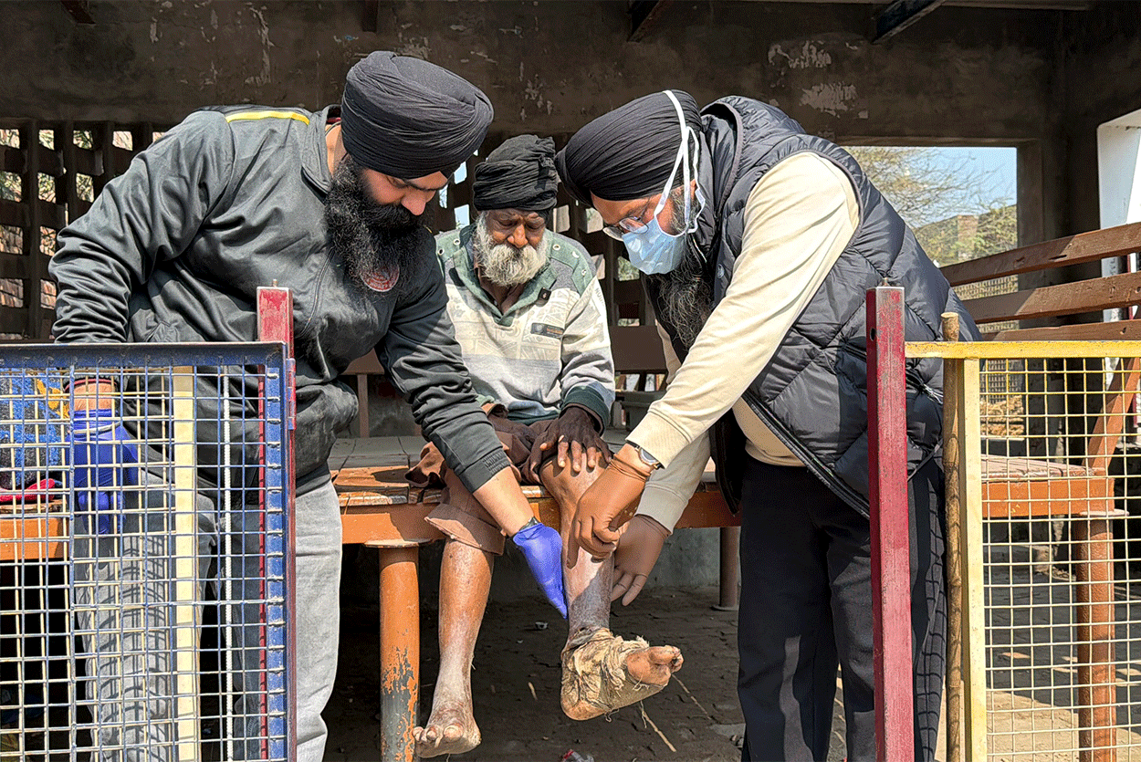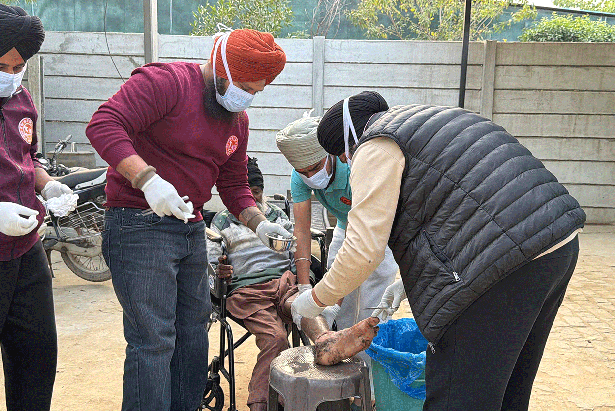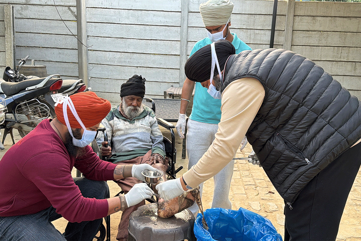 Bapu Ji was found sitting in the village “Sath” (resting place) built in the Gill Patti area of his own village, where worms were eating away at his leg. He had never married. Although his two brothers and four nephews also live in the same village, according to Bapu Ji, he did not receive any share of his land. What the full truth is, only Waheguru knows. However, at present, Bapu Ji’s condition was extremely painful and heartbreaking.